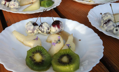 Verse kersen gedoopt in witte chocolade met kokos, peer, kiwi en lavendelsiroop