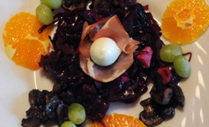 Creatief voorgerecht met rode kool, champignons en gevarieerde garnering