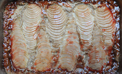 Taart met zandtaartdeeg, verse peren en amandelvulling en evt. een likje jam